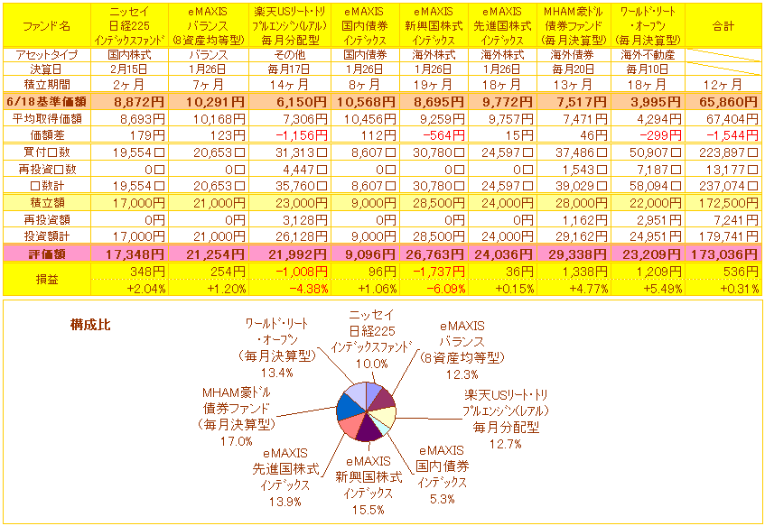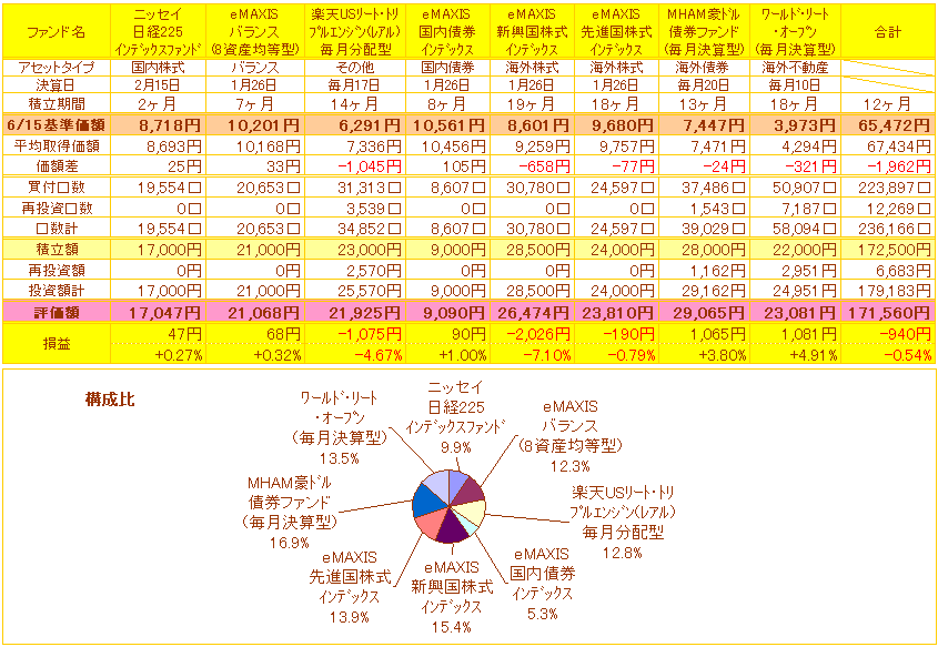 私の損益一覧表はEXCELの別シートに各ファンド毎に買い付けの履歴を作っていて、その表からデータを参照させて作成しています。