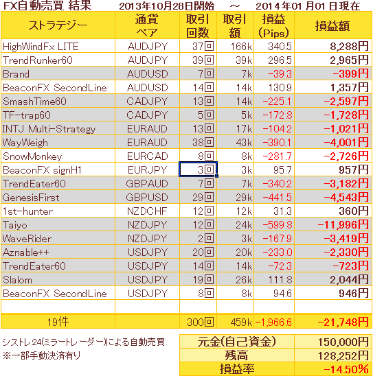 2013年10月28日から始めたFXの自動売買は、 マイナスのまま2013年度が終わってしまいました 元金も途中で30万から15万円に減額し、 細々と続けております。